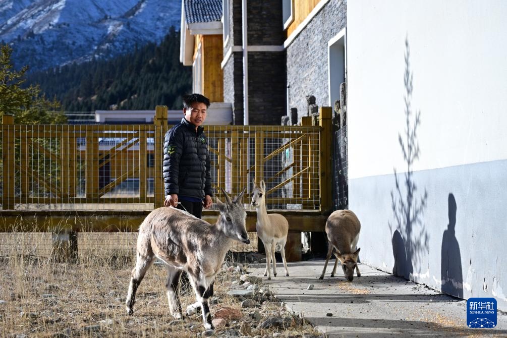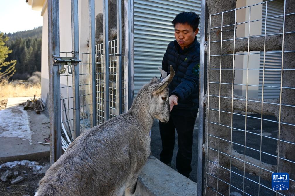 11月10日,在救护繁育站,工作人员刘林春和一只被救助的岩羊互动。新华社记者 齐芷玥 摄
